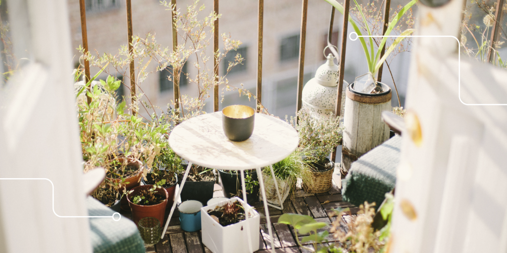 Plants, lanterns & low-placed lighting – Plants are obviously going to be a recurring theme when it comes to creating a balcony aesthetic you’re happy with. Combining potted plants with lanterns and low-placed lighting at varying heights is a great option when it comes to creating a space that’s three-dimensional and supremely vibey. We definitely recommend using flameless candles to be on the safe side.