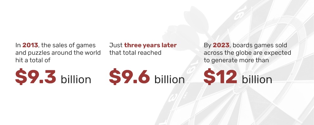 In 2013, the sales of games and puzzles around the world hit a total of $9.3 billion. Just three years later that total reached $9.6 billion. By 2023, boards games sold across the globe are expected to generate more than $12 billion in revenue.